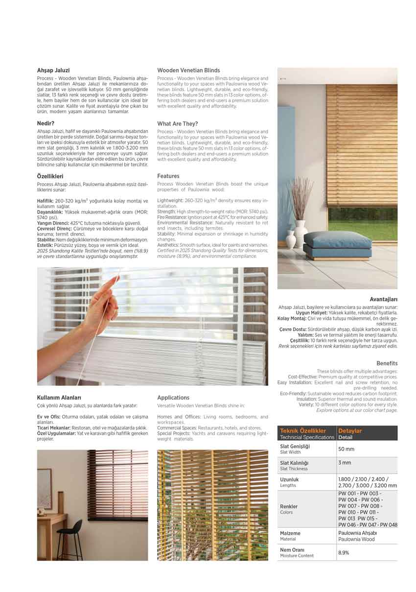 Paulownia ahşabından üretilen ahşap jaluzi sistemleri, mekanlarınıza doğal zarafet ve işlevsellik kazandırır. 50 mm genişliğinde slatlar ve farklı renk seçenekleri ile her ortama uyum sağlar.
